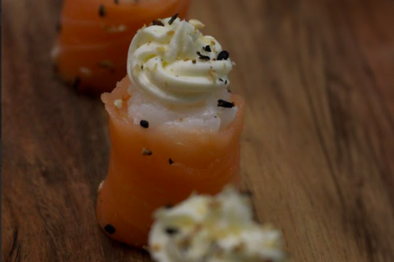 Ball of sushi rice wrapped in a thin slice of fish (often salmon) and topped with ingredients